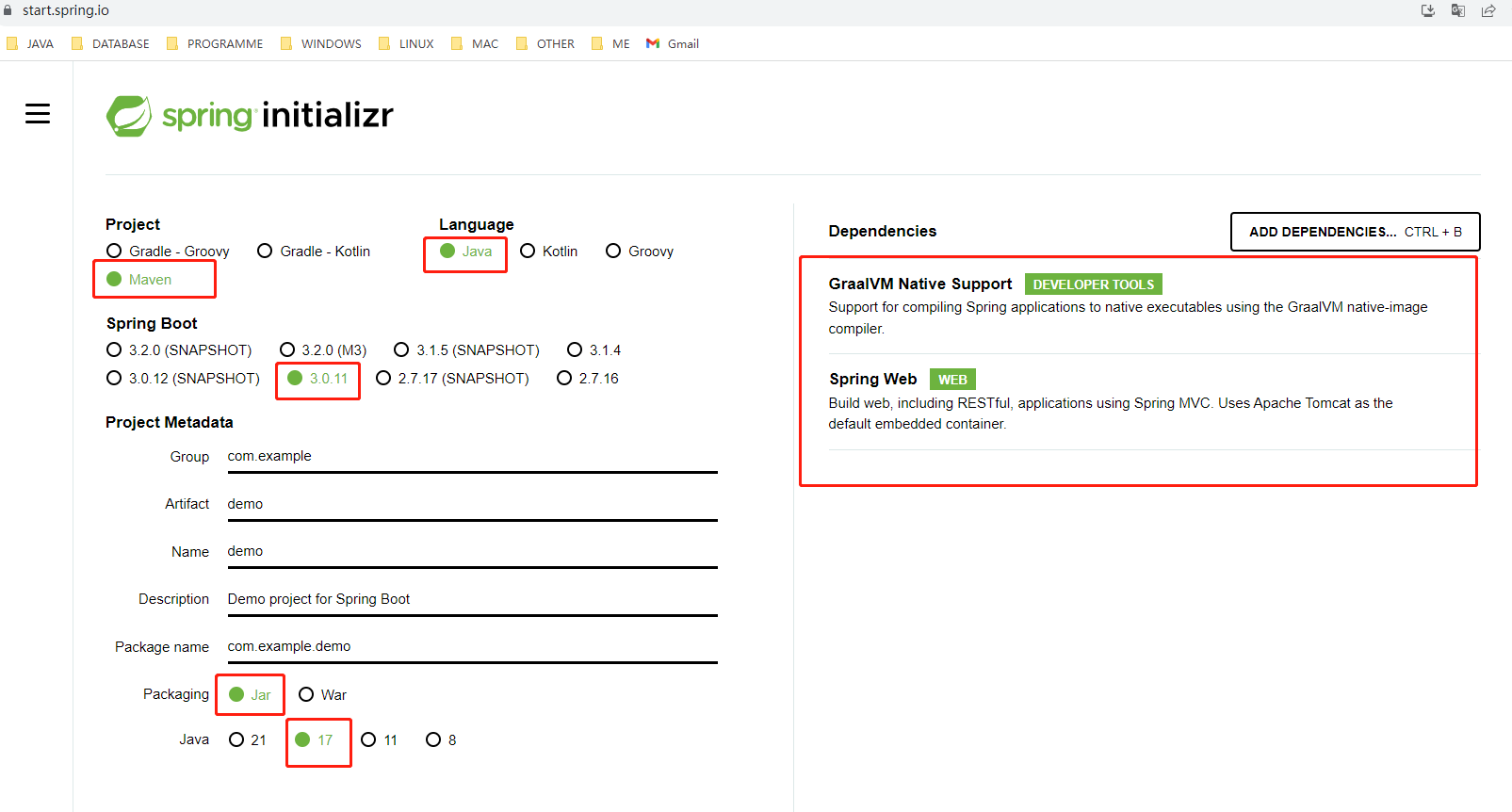 使用 https://start.spring.io/ 创建一个Spring Boot 3.0应用: